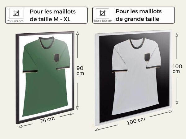 Quelle taille doit avoir le cadre de ton maillot ? Cela dépend de ton maillot ! Pour les maillots jusqu'à la taille XL, notre cadre pour maillot de 75 x 90 cm est l'idéal. Ce format, avec son rapport largeur/hauteur parfaitement adapté à la forme des maillots, met ton maillot en valeur de manière optimale.